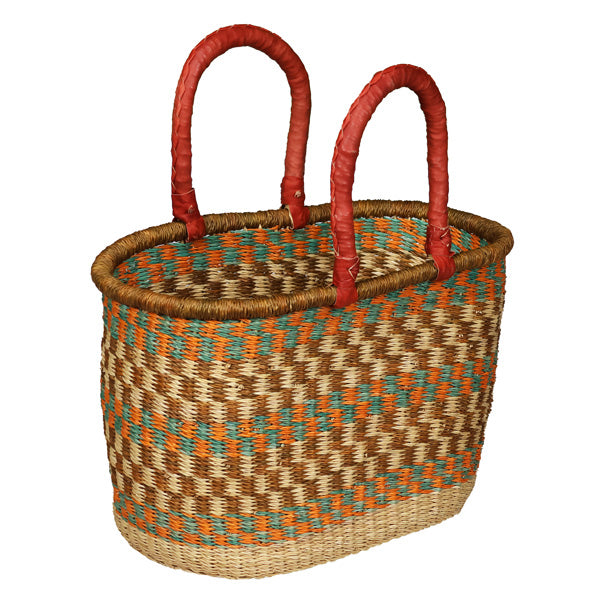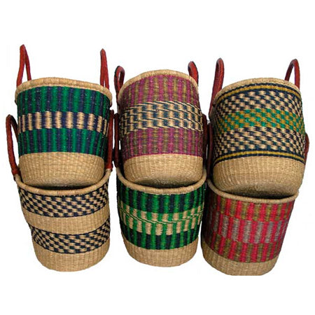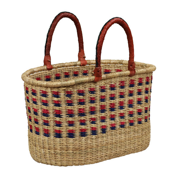 Beautifully handmade with two leather handles, this basket comes in assorted colors and patterns. Great for the beach, interior design and all kinds of storage. Each basket is unique. Leather color may vary.