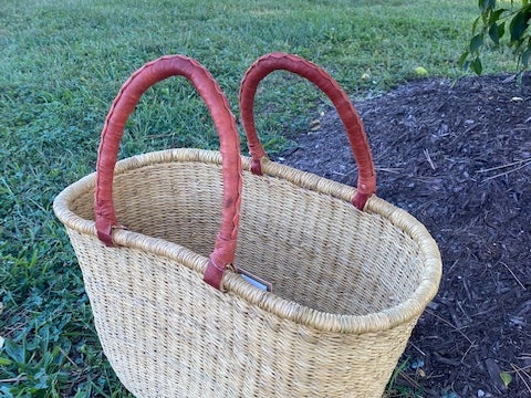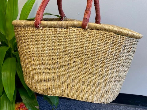 Our fair trade oval market basket is handwoven from elephant grass and comes with two sturdy leather handles. Container or utility baskets like these are durable and can be put to multiple uses, such as: a beach bag, carry-on or weekender, crafting or knitting caddy, farmer's market basket, grocery or shopping bag, hamper or laundry basket, handbag or tote, home decor basket, laptop carrier, picnic basket, pot planter, tabletop centerpiece, or for storage, to name a few!