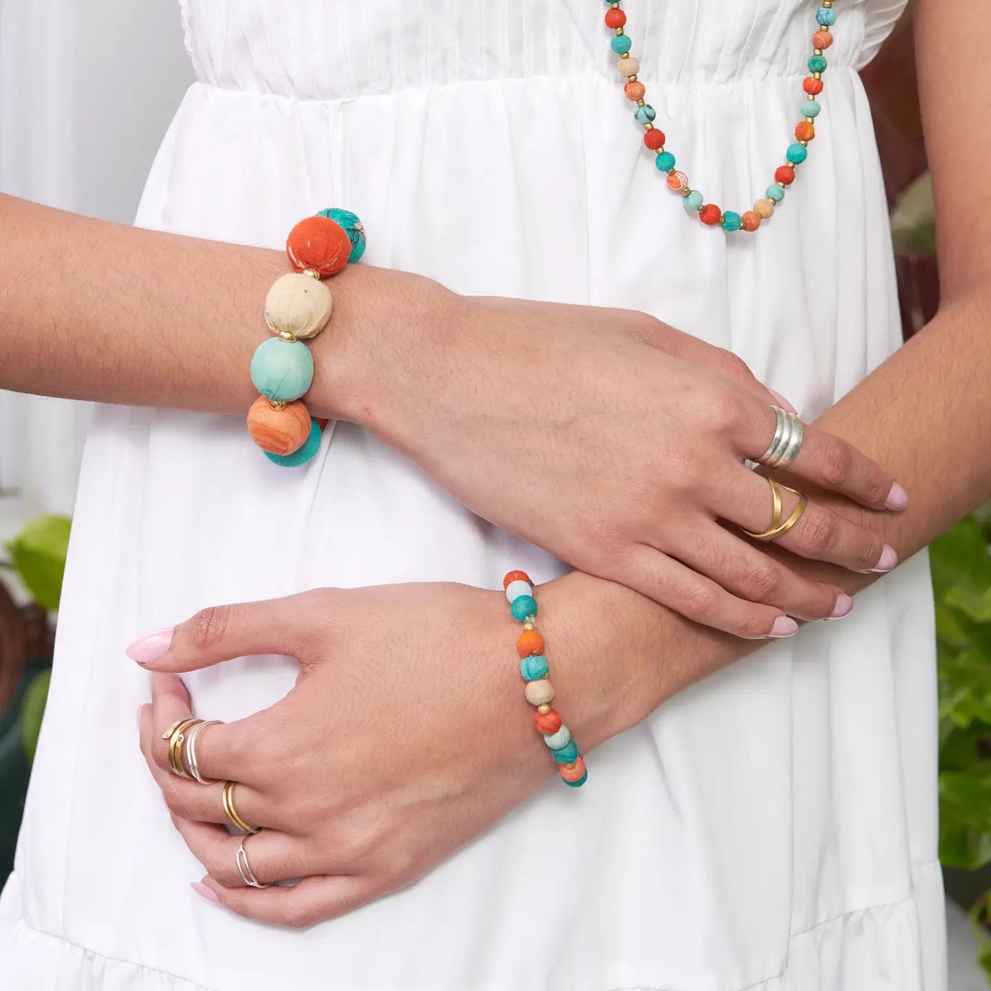 Inspired by the sparkling blue waters and sunkissed landscape of the remote island in Italy, the Kantha Capri Collection includes best-selling styles in shades of turquoise, coral, and cream. The Kantha Capri Sonnet Bracelet features groups of colorized Kantha beads separated by smaller metallic beads. It is thoughtfully crafted from reclaimed Kantha & Sari textiles that have been hand-sorted, so each piece is slightly different.