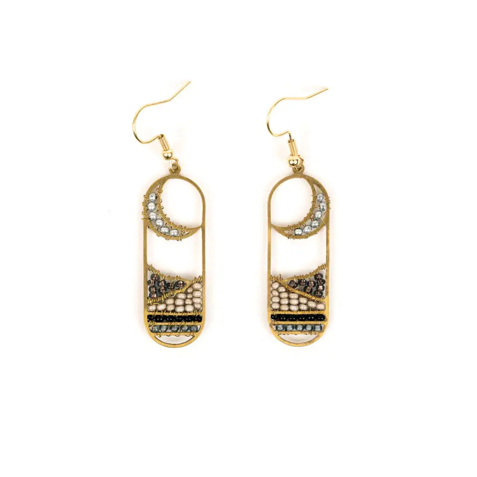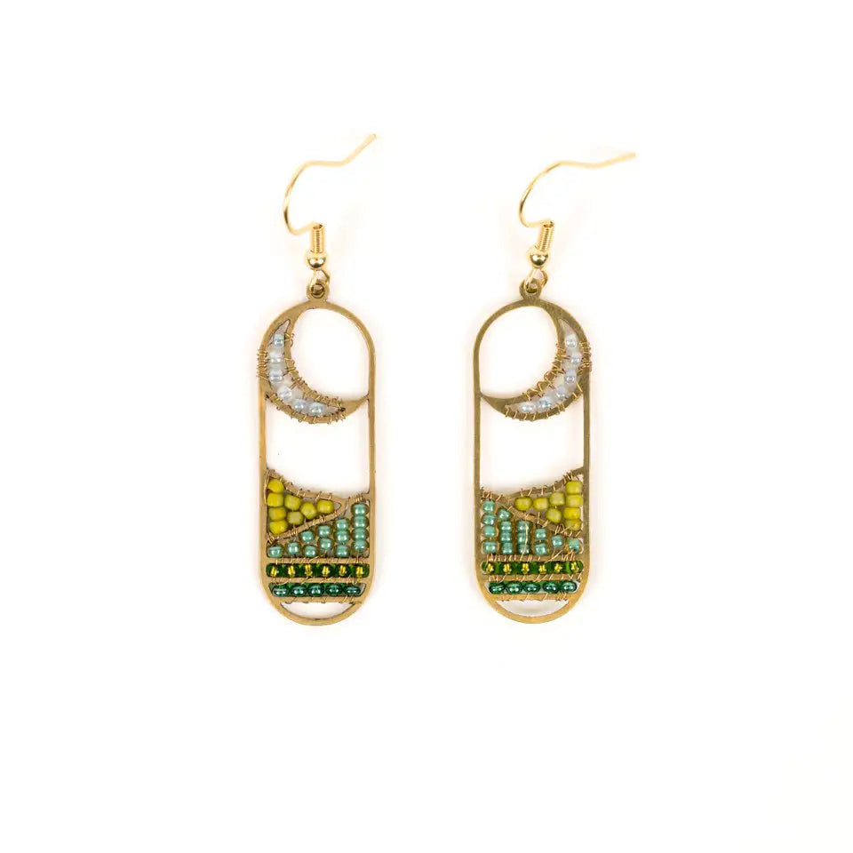 The Moonview Earrings frame a crescent moon above a colorful beaded field. A 1.5 inch long brass oval creates the framework for this lovely design.