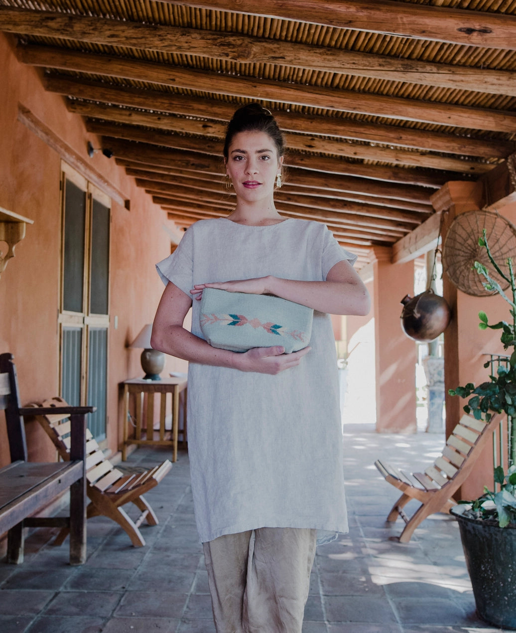 The Wind + Arrows pattern features a double arrow design in pale yellow, emerald green and coral pink against mint green. The traditional design found is taken from pre-Hispanic Zapotec ruins. Each of these symbols has a deep cultural meaning to the people who weave them. We are honored to share these beautiful designs with the world.