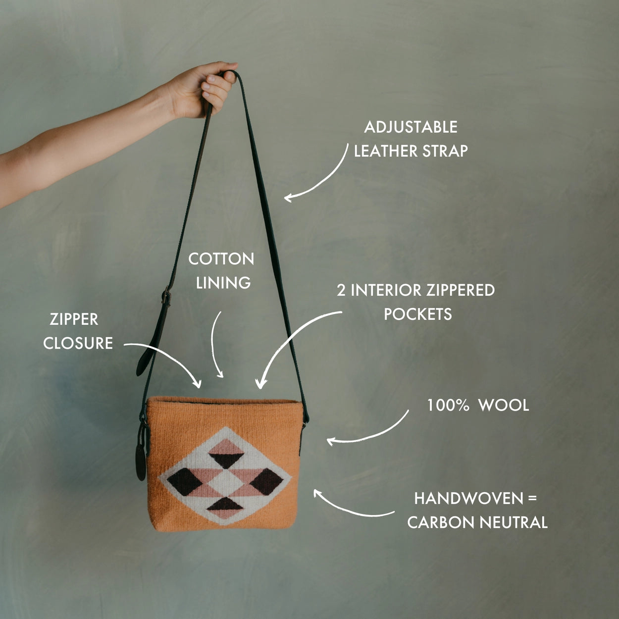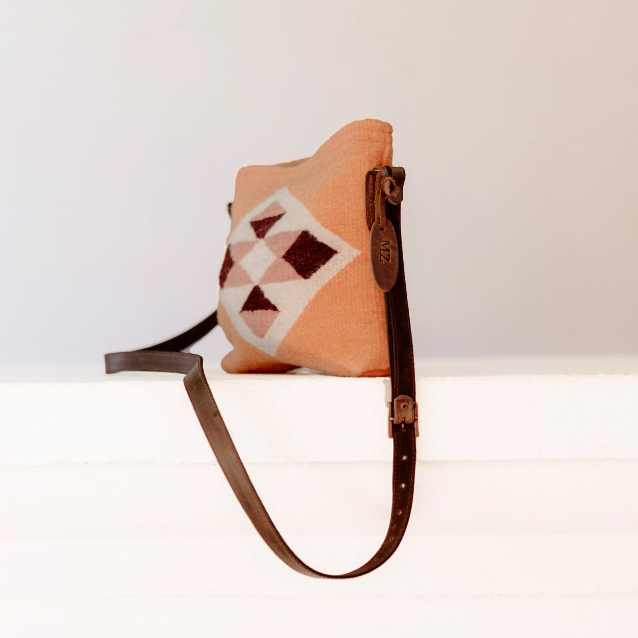 Meet your new go-to bag for day or night - the Sunstone Crossbody. Completes your look - whether it’s jeans and a tee or your favorite sundress. Keep your hands free and your essentials contained with this beautiful crossbody bag. Includes two interior spacious zippered pockets. The Sunstone pattern features an abstract Zapotec diamond design in shades of tangerine, rose quartz, dark rosewood, and cream.