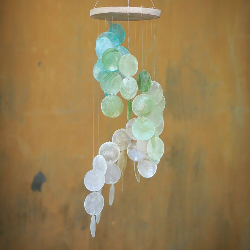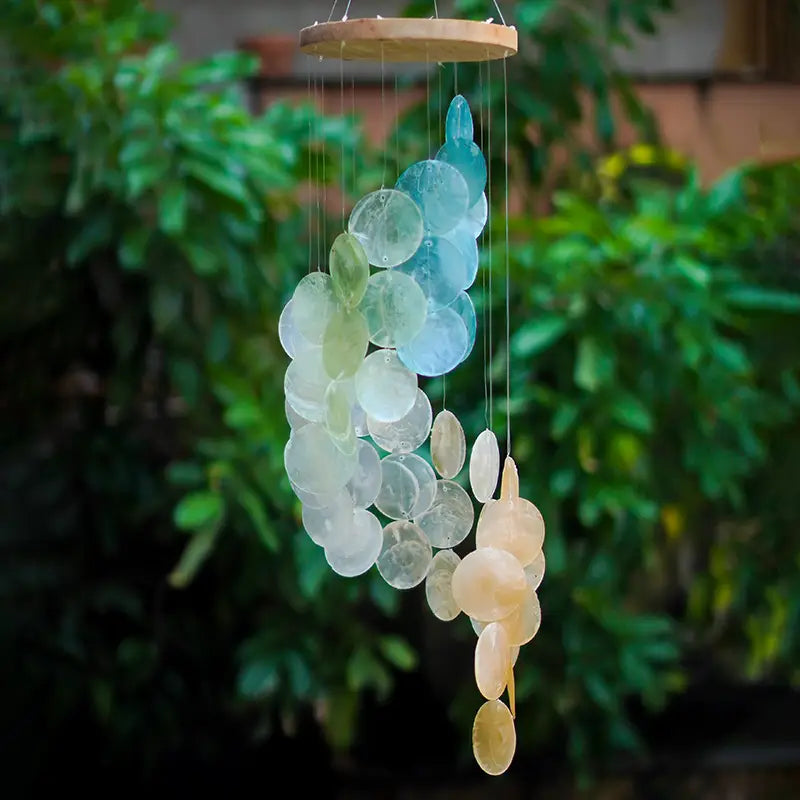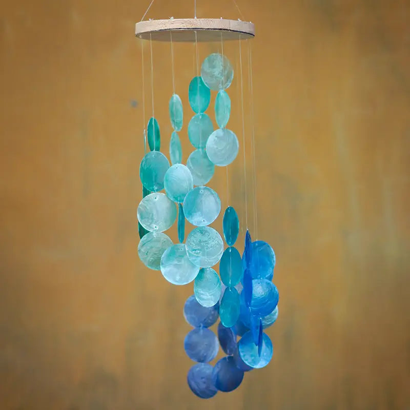 Our capiz chimes are made up of a stunning array of shapes and colors. They sparkle in the light, and when placed outside, create a gentle tinkling of the shells.