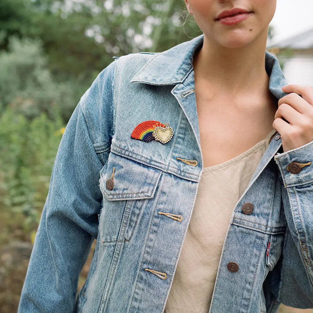 Our Rainbow Brooch Pins are handcrafted by artisan makers in India, who use colorful beads, thread, and sequins to create cute motif brooches. Wear or gift a single pin or together with other pins to show off a unique sense of style!