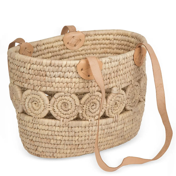 One of our favorites is back! Woven medallions are a handsome addition to this well-crafted palm leaf shopping basket. Strong sewn leather straps make a sturdy basket that will last.