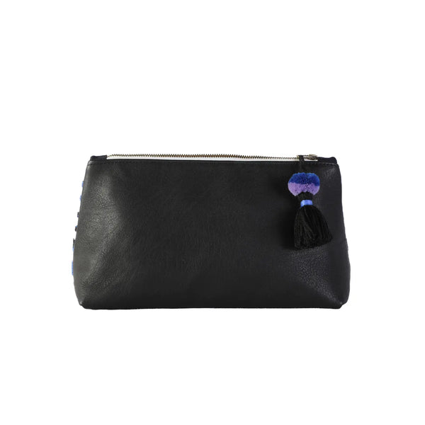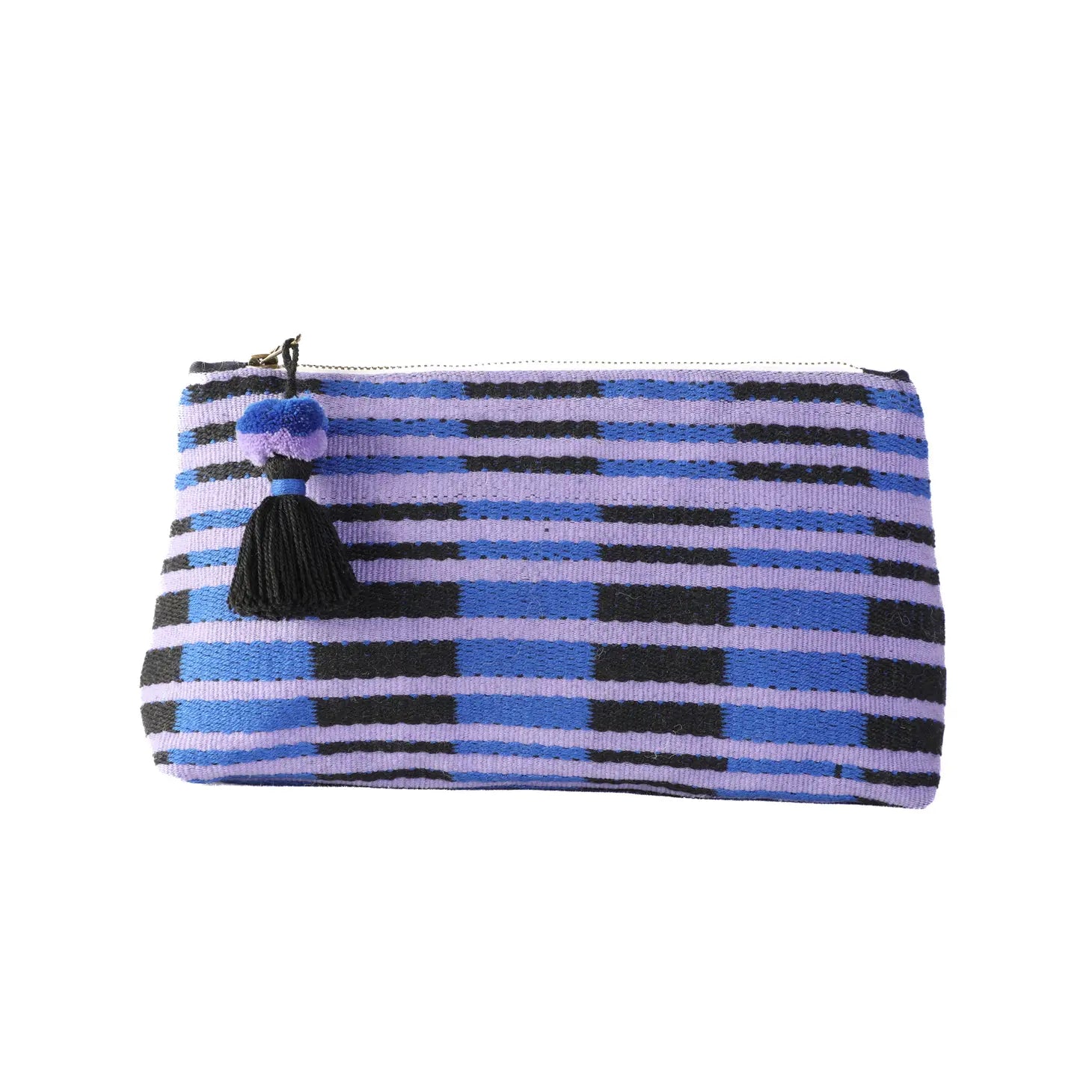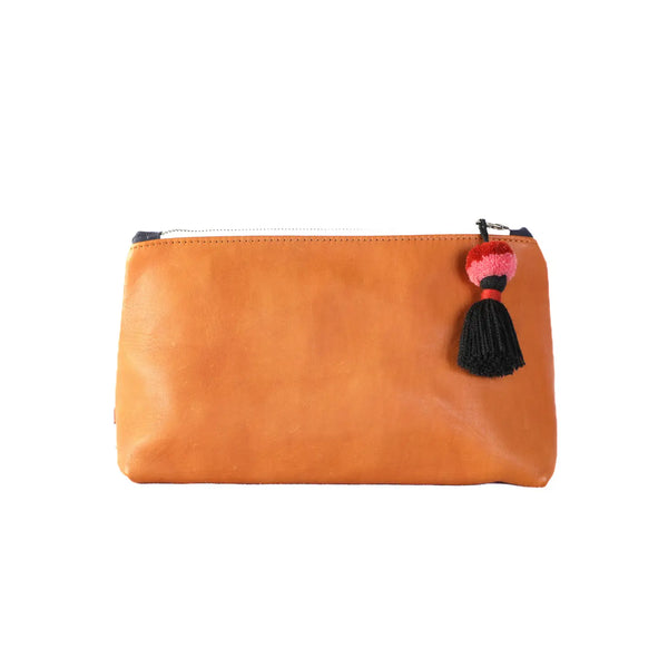 Store and take along all your skincare and beauty products with our easy, spacious, large cosmetic pouch. Featuring a water-resistant lining for simple cleaning and efficient mobility on any travel adventure. Each pouch is handwoven and features bold colors, a statement tassel zipper pull, and a chic leather back. Pair it with our small cosmetic pouch for the complete travel set.