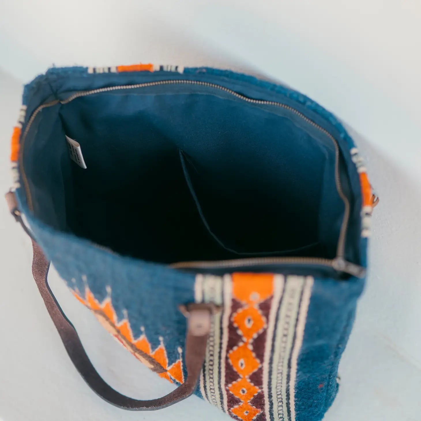 The Tribal Diamond pattern features an intricate Zapotec diamond and agave design in burnt orange and brown on navy blue. The Adobe + Azul pattern features a God's eye design in soft mint green on adobe red.