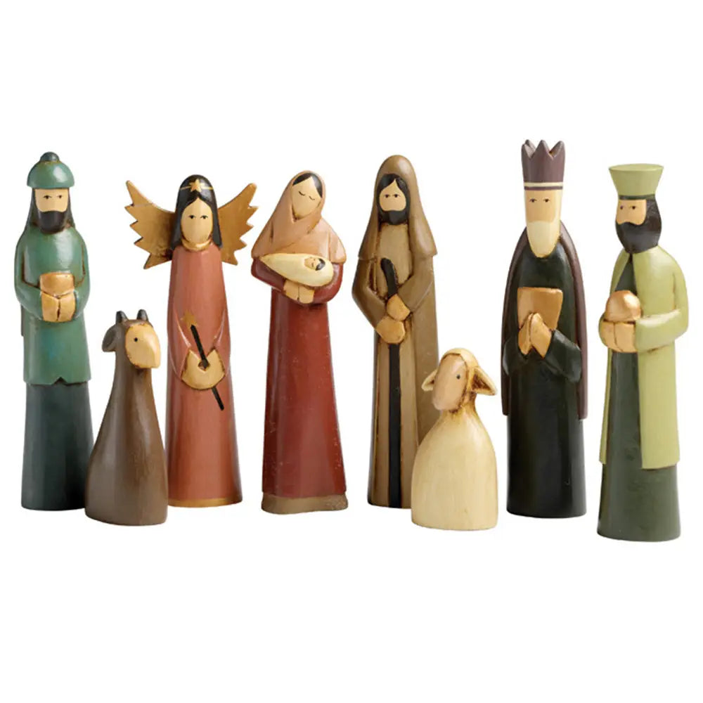 Hand carved from Alstonia, a tropical evergreen tree native to Indonesia, this contemporary wooden nativity features eight figures, simply ornamented and painted in muted tones.
