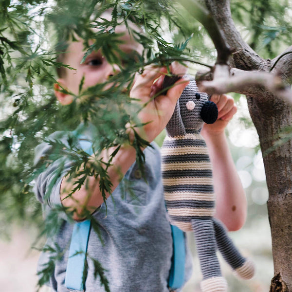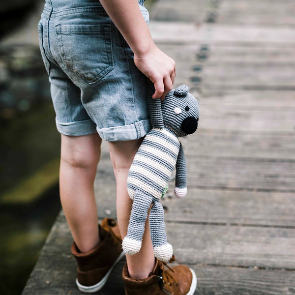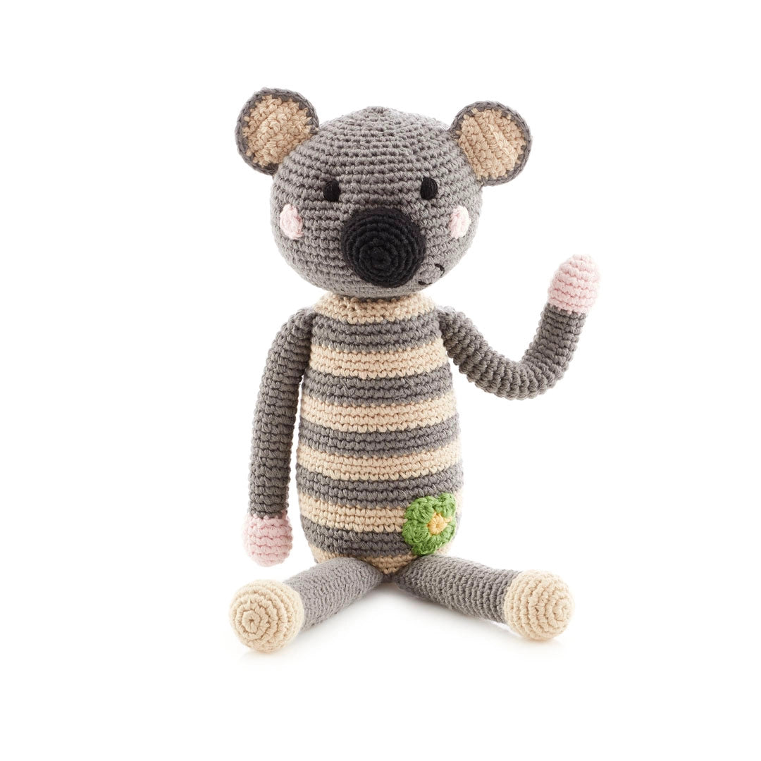 Koala loves to travel and is happiest when taken on trips and cuddled. He loves new adventures! This knit toy is handmade with soft cotton yarn.