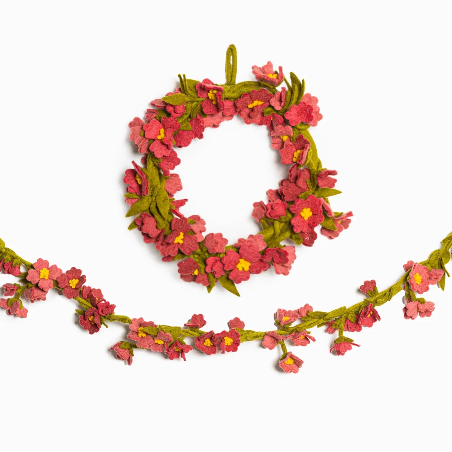 Welcome the fleeting beauty of cherry blossoms into your home—no season required! Our Felt Cherry Blossom Garland showcases a cascade of soft pink blooms and rich green leaves, hand-stitched with care to capture the delicate elegance of this beloved flower. Perfectly complementing our Felt Cherry Blossom Wreath & Flower, this garland creates a harmonious, nature-inspired décor theme. Drape it across your mantel, adorn your table, or frame a doorway to bring a touch of springtime whimsy to any room. Handmade by fair trade artisans, this garland is not only a celebration of craftsmanship but also a meaningful way to support global communities.