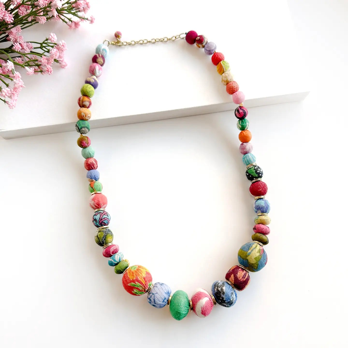 Unique, oval-shaped Kantha beads form the center of this graduated necklace. They then alternate with round beads and smaller-sized ovals to create this incredible statement style. Matte metal discs separate the beads for a subtle pop of shimmer. The dimensional beads allow for lots of the gorgeous patterns to show through. Crafted from repurposed Sari and Kantha fabric, the colorful beads are all one-of-a-kind.