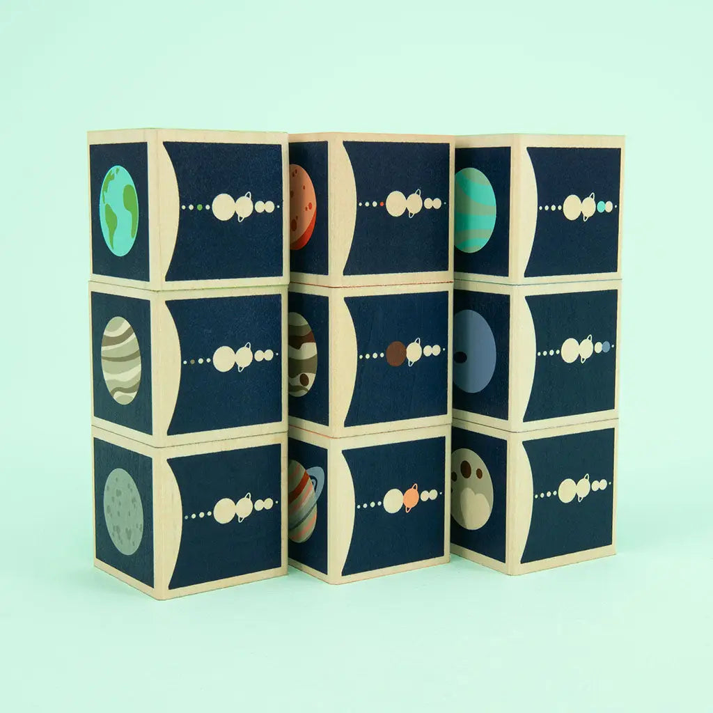 Two debossed sides feature the planet’s symbol, name, and number of moons. The four printed sides reveal a planet illustration, diameter, location, and distance from the sun. So much to explore. Which planet has the most moons? Which has the least? Which is the closest to Earth? Which is farthest? Which is the biggest? The smallest? How will you line them up? In order from the sun? Or stacked to please your eye for color and design?