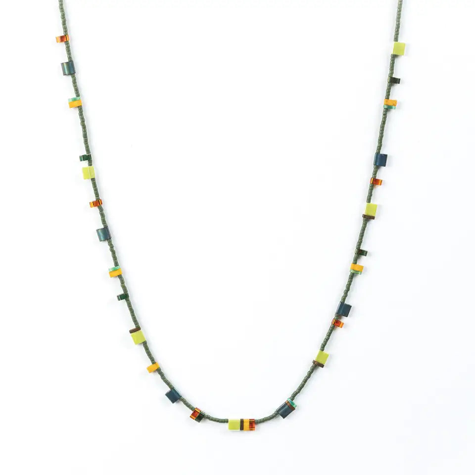 A pull over necklace made with Miyuke tile glass beads in warm and cool tones for any occasion.